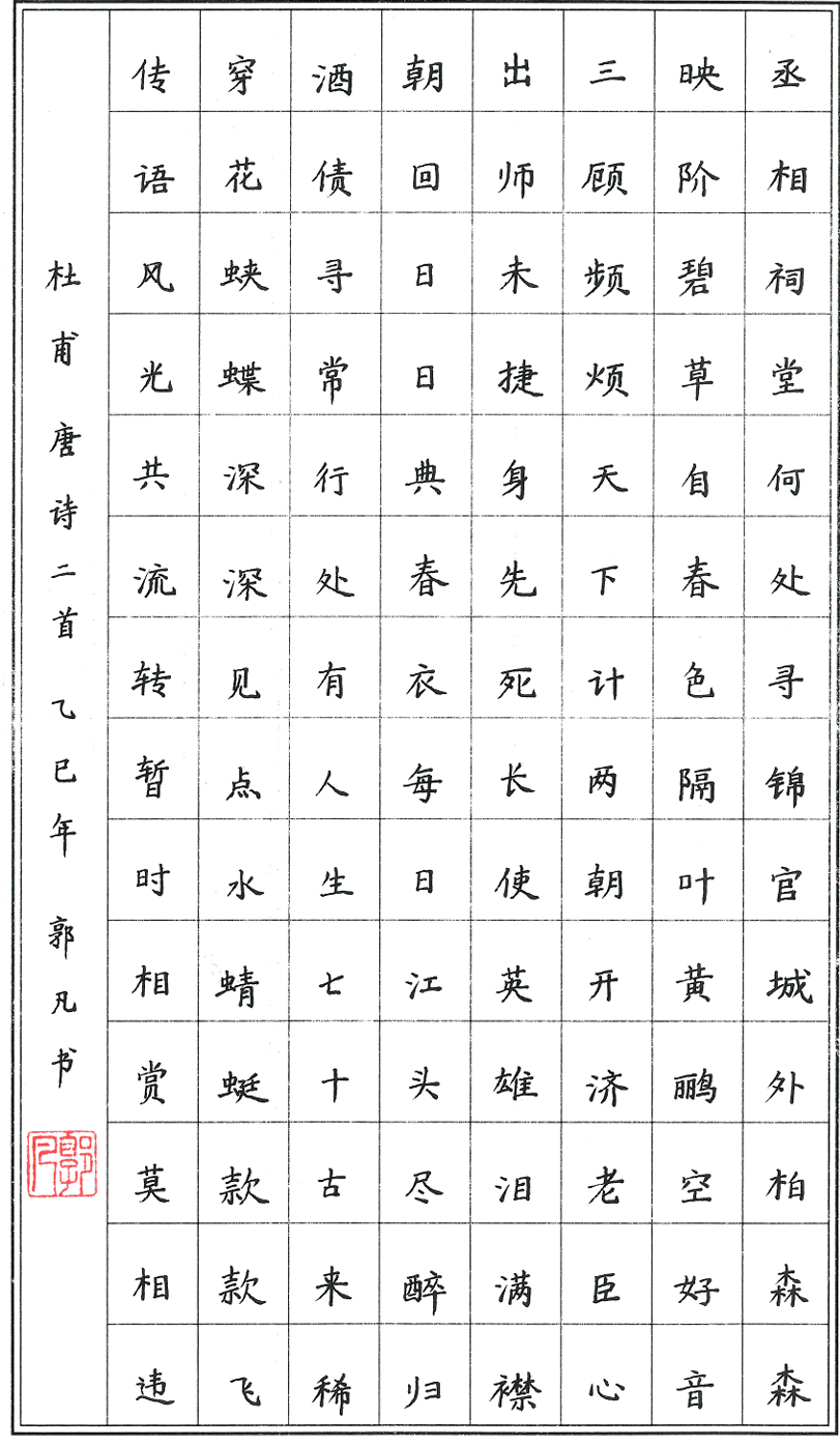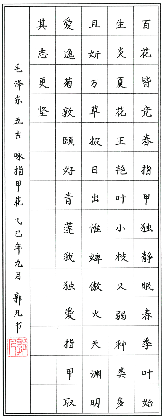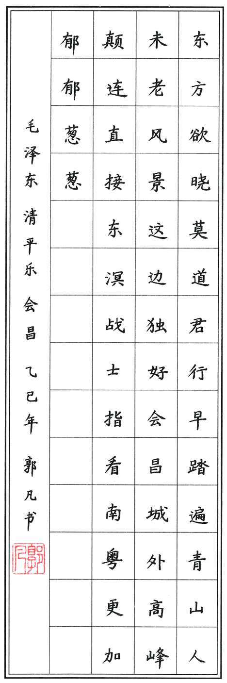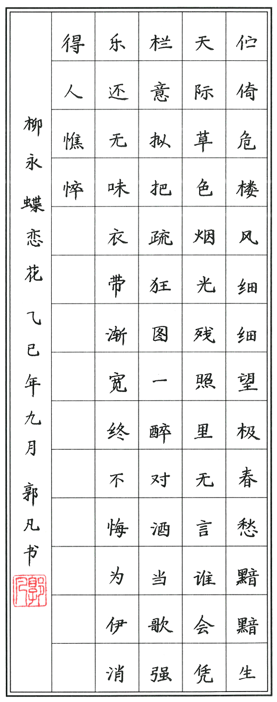 郭凡,男,64岁。香港中国书法家协会荣誉主席。2004年10月在“十月赞歌——庆祝祖国五十五华诞全国书画摄影艺术邀请赛”上获硬笔金奖。2005年在“兰花杯”第二届全国青少年书画段位大赛上获硬笔一等奖,并授予八段艺术段位。2006年入选《中华传世书画鉴赏》一书并获硬笔“传世金奖”。2009年在《中国艺术家大典》征稿评选活动中荣获硬笔书法金奖。2010年在由中国美术教育委员会和中国书画摄影家协会举办的“黄山杯第十八届中国当代书画名家作品邀请赛”上获硬笔书法金奖。2011年荣获“名家名作”中国书画家优秀作品邀请赛硬笔金奖。2011年在第十九届“母亲颂”全国书画摄影作品大赛中获硬笔金奖。2013年在第二十三届“中华杯”全国书画摄影大展中获硬笔金奖。2013年在“滕王阁杯”中国南昌第9届文学艺术大奖赛中获硬笔书法一等奖。2013年七月在“墨舞中华·第一届全国书画家作品邀请赛”中获硬笔金奖。2014年在第十二届“阳光杯”全国书画摄影大赛中获硬笔书法金奖。2015年在全国第11届“滕王阁杯”文学艺术大赛中获硬笔书法一等奖。2015年在“黄山杯”全国书画摄影大展赛中荣获金奖。2017年在“艺海杯”全国书画摄影大展赛中荣获硬笔金奖。2021年在香港中国书法家协会举办的第十五届“中国艺术家作品邀请展”评比大赛中荣获第一名。