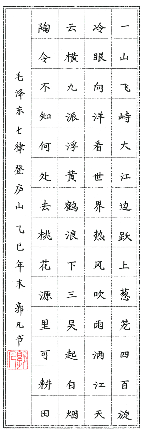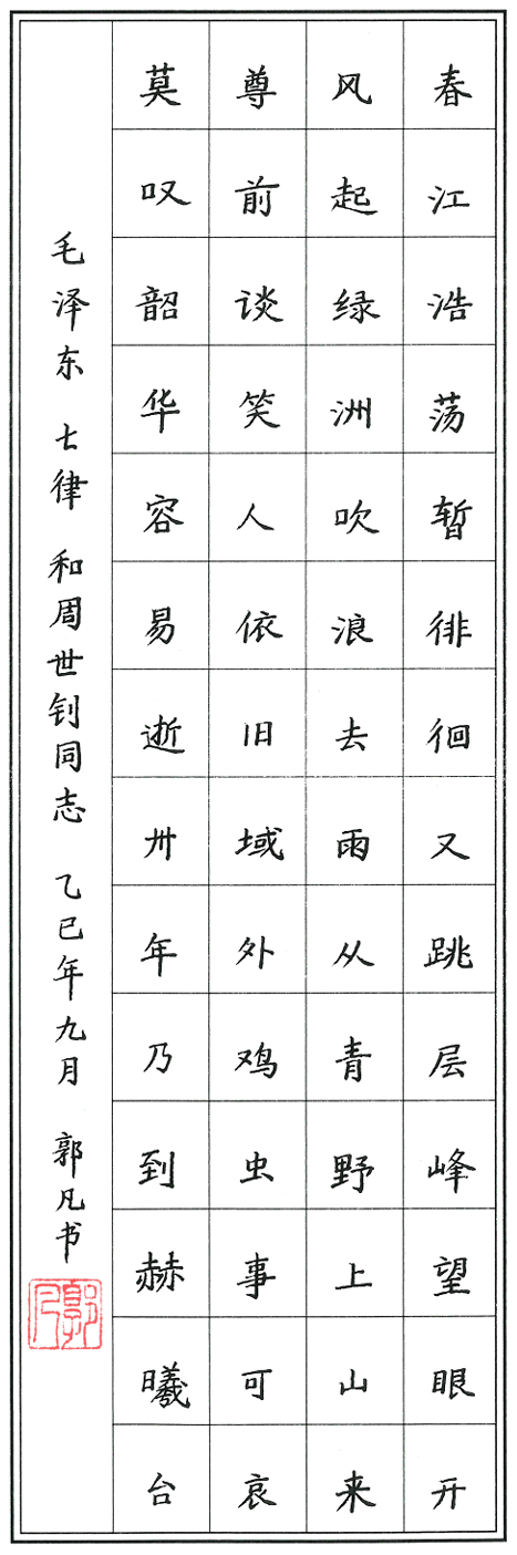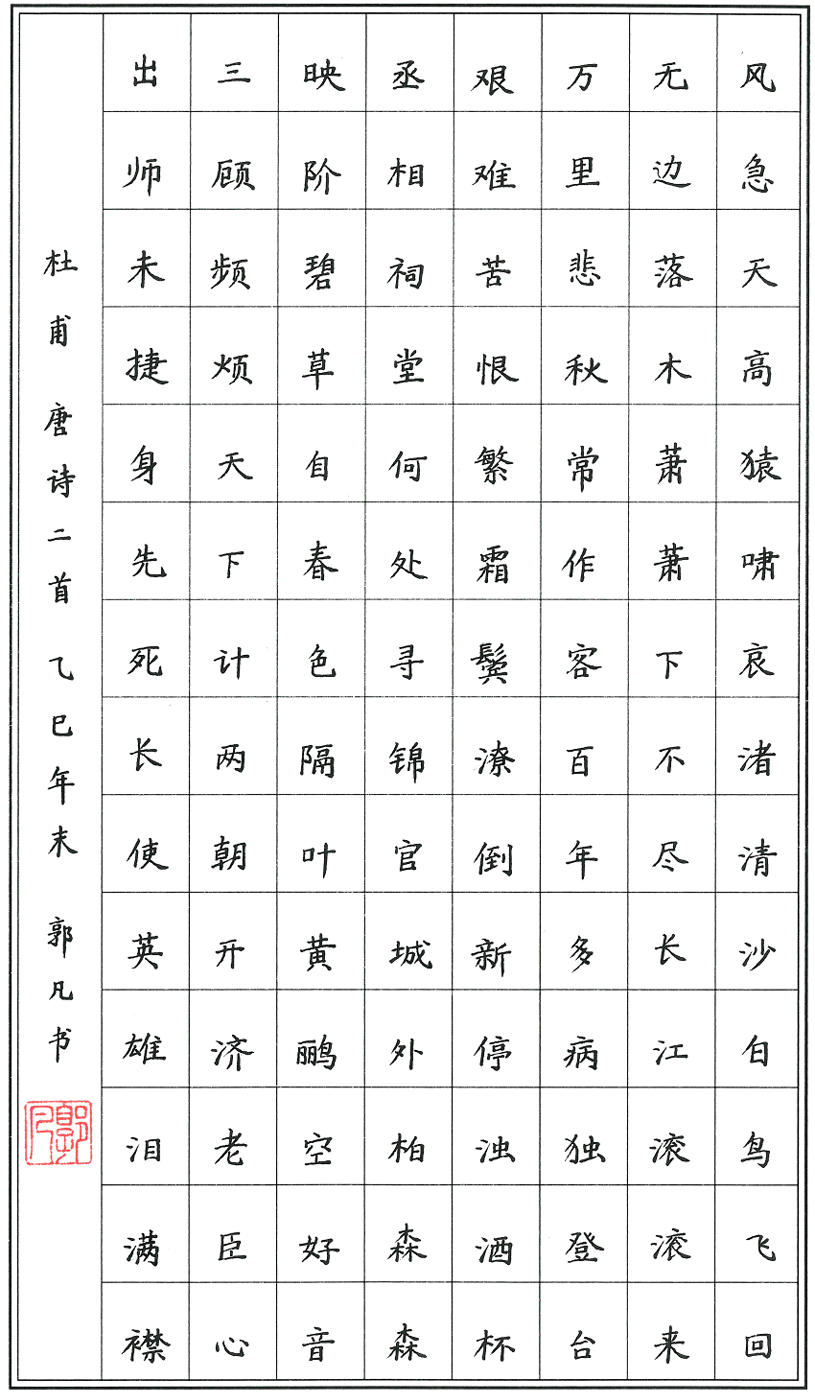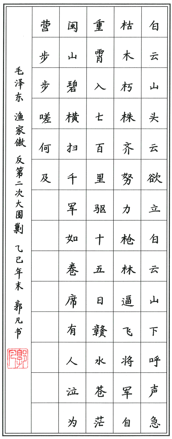 郭凡,男,64岁。香港中国书法家协会荣誉主席。2004年10月在“十月赞歌——庆祝祖国五十五华诞全国书画摄影艺术邀请赛”上获硬笔金奖。2005年在“兰花杯”第二届全国青少年书画段位大赛上获硬笔一等奖,并授予八段艺术段位。2006年入选《中华传世书画鉴赏》一书并获硬笔“传世金奖”。2009年在《中国艺术家大典》征稿评选活动中荣获硬笔书法金奖。2010年在由中国美术教育委员会和中国书画摄影家协会举办的“黄山杯第十八届中国当代书画名家作品邀请赛”上获硬笔书法金奖。2011年荣获“名家名作”中国书画家优秀作品邀请赛硬笔金奖。2011年在第十九届“母亲颂”全国书画摄影作品大赛中获硬笔金奖。2013年在第二十三届“中华杯”全国书画摄影大展中获硬笔金奖。2013年在“滕王阁杯”中国南昌第9届文学艺术大奖赛中获硬笔书法一等奖。2013年七月在“墨舞中华·第一届全国书画家作品邀请赛”中获硬笔金奖。2014年在第十二届“阳光杯”全国书画摄影大赛中获硬笔书法金奖。2015年在全国第11届“滕王阁杯”文学艺术大赛中获硬笔书法一等奖。2015年在“黄山杯”全国书画摄影大展赛中荣获金奖。2017年在“艺海杯”全国书画摄影大展赛中荣获硬笔金奖。2021年在香港中国书法家协会举办的第十五届“中国艺术家作品邀请展”评比大赛中荣获第一名。