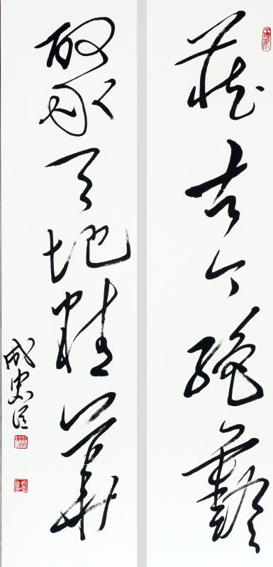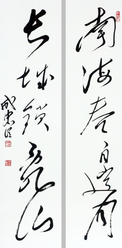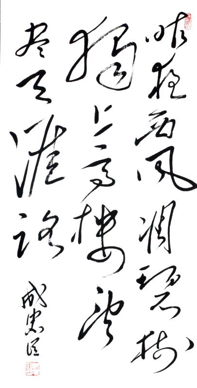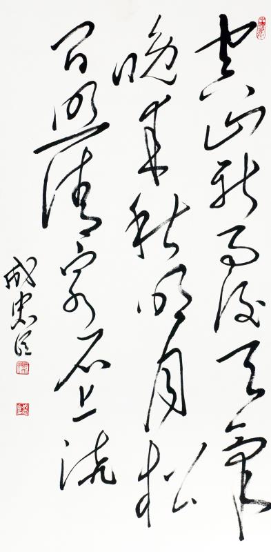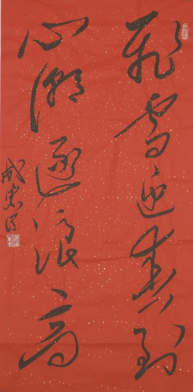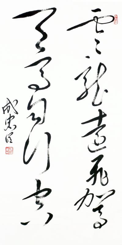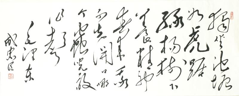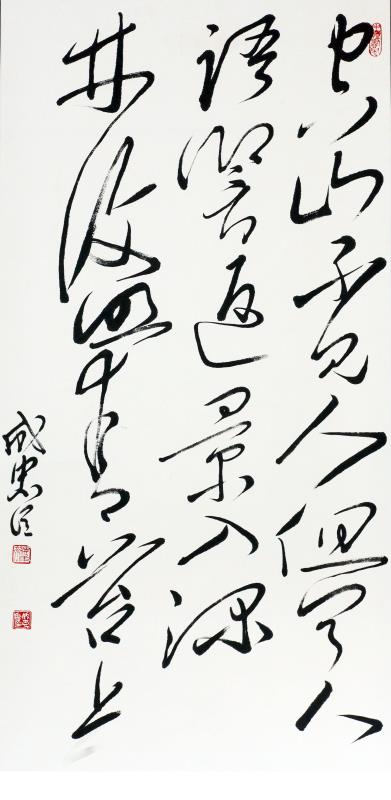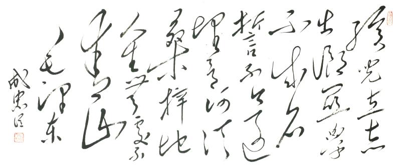 成忠臣,1964年3月出生于山东海阳,自小爱好广阔,对历史 、文学、诗词、书法和美术均有较深造诣。少年时代曾拜师画家杨奎林学习国画、青年时代赴济南得到名画家于希宁、黑伯龙的教导,后又进京有幸受名画家叶浅予、刘继卣、董寿平诸位老师悉习指导,对中国画熔诗书画印于一炉的综合性艺术特点有正确地认识,对中国绘画意象性“外师造化”、“中得心源”及“迁想妙得”创作原则有较全面的把握。他从14岁起开始研习书法,初学颜真卿、苏东坡、郑板桥、王铎,从80年代中期转攻毛泽东书法,他是在根基扎牢后转向毛体书法。他从九十年代中期倡导毛体书风,是毛体书风的领军人。他的毛体书风作品在国内外引起很大反响。在他的作品里,大气磅磗的毛体狂草被“汪洋恣肆”了一下,骨力通达、真力弥满的笔意之下不令精到的提按使转的体现。以取法毛泽东书风,高古灵动的大作,大有不让前贤的气概。而以坚挺有力线条的世界长线的纵横盘旋,短线的铿锵节奏汇合谱写了一曲宏大丰富、奇崛华滋的交响曲,真艺术、大家风范一览无余。