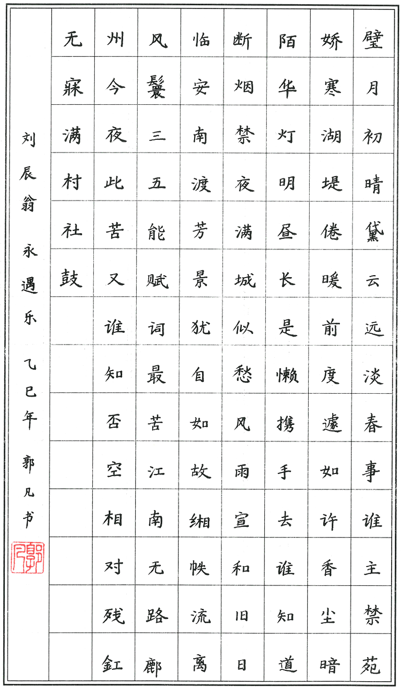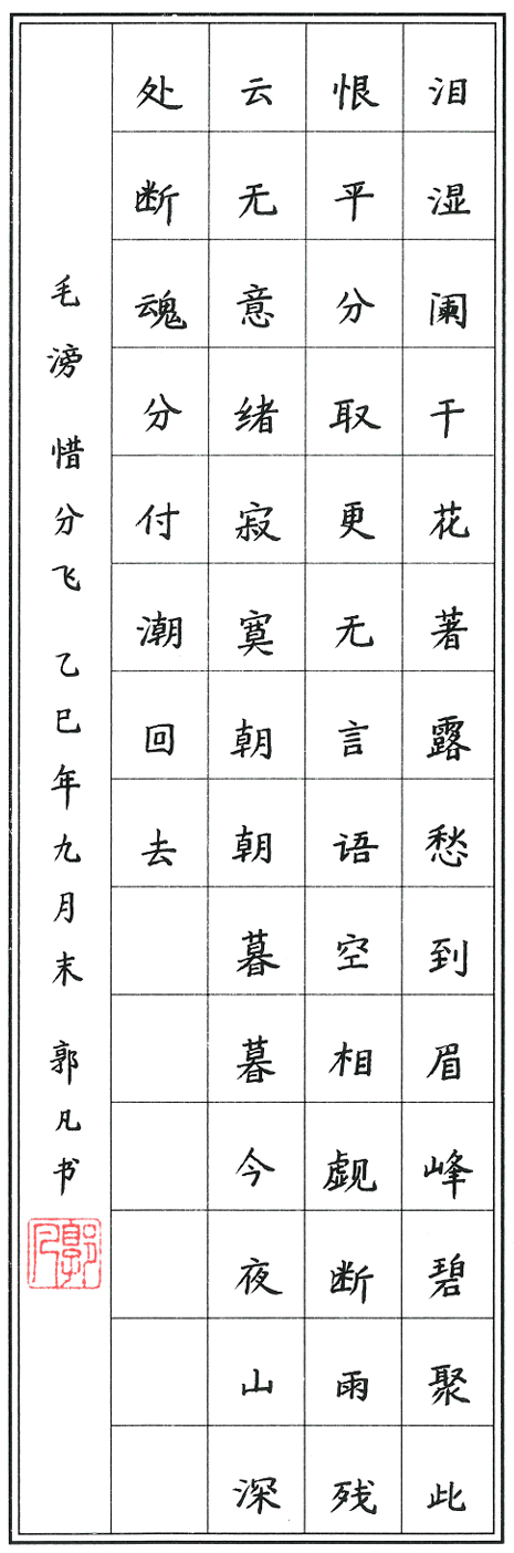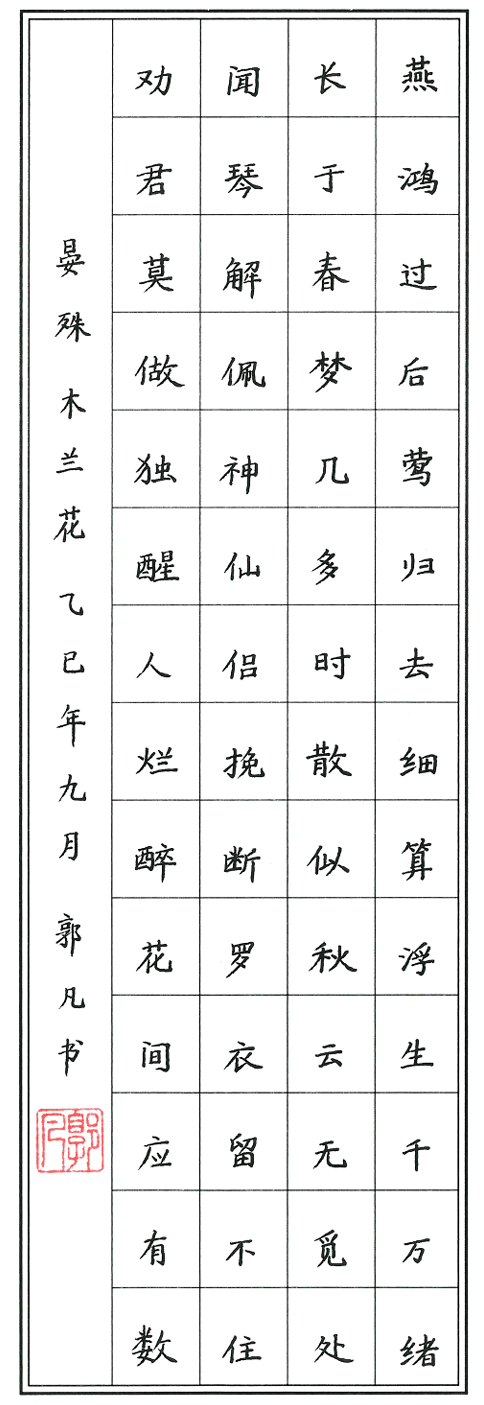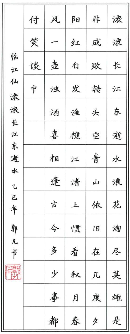 郭凡,男,64岁。香港中国书法家协会荣誉主席。2004年10月在“十月赞歌——庆祝祖国五十五华诞全国书画摄影艺术邀请赛”上获硬笔金奖。2005年在“兰花杯”第二届全国青少年书画段位大赛上获硬笔一等奖,并授予八段艺术段位。2006年入选《中华传世书画鉴赏》一书并获硬笔“传世金奖”。2009年在《中国艺术家大典》征稿评选活动中荣获硬笔书法金奖。2010年在由中国美术教育委员会和中国书画摄影家协会举办的“黄山杯第十八届中国当代书画名家作品邀请赛”上获硬笔书法金奖。2011年荣获“名家名作”中国书画家优秀作品邀请赛硬笔金奖。2011年在第十九届“母亲颂”全国书画摄影作品大赛中获硬笔金奖。2013年在第二十三届“中华杯”全国书画摄影大展中获硬笔金奖。2013年在“滕王阁杯”中国南昌第9届文学艺术大奖赛中获硬笔书法一等奖。2013年七月在“墨舞中华·第一届全国书画家作品邀请赛”中获硬笔金奖。2014年在第十二届“阳光杯”全国书画摄影大赛中获硬笔书法金奖。2015年在全国第11届“滕王阁杯”文学艺术大赛中获硬笔书法一等奖。2015年在“黄山杯”全国书画摄影大展赛中荣获金奖。2017年在“艺海杯”全国书画摄影大展赛中荣获硬笔金奖。2021年在香港中国书法家协会举办的第十五届“中国艺术家作品邀请展”评比大赛中荣获第一名。