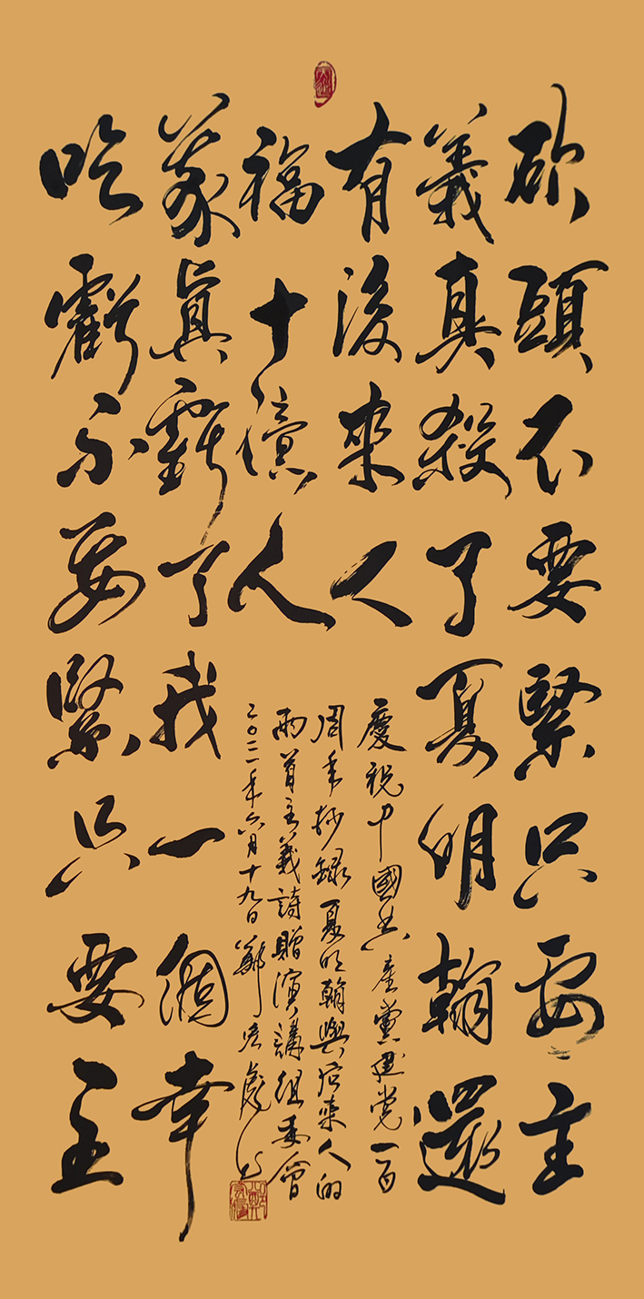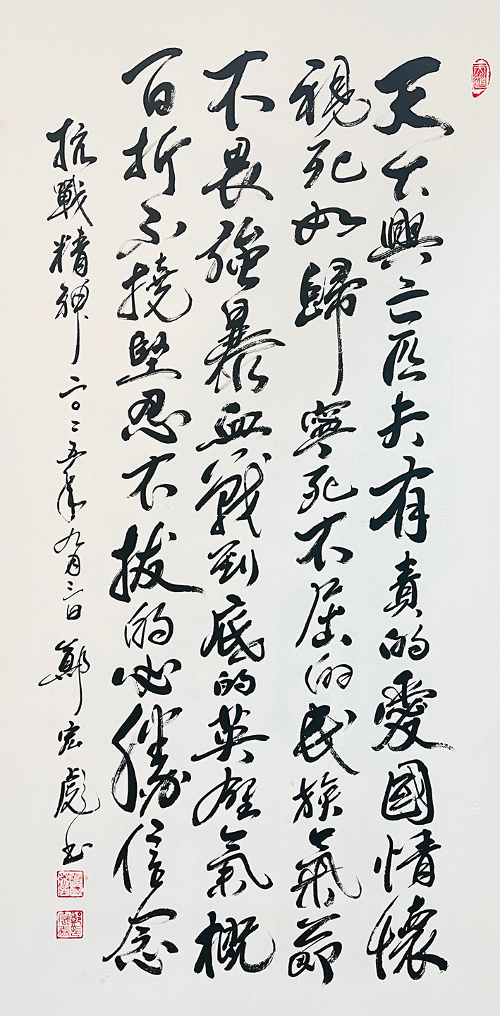在战火中创作、并于1982年1月17日《战士报》(4630期)上发表的“吃亏不要紧,只要主义真。亏了我一个,幸福十亿人”战地诗,曾流传全国,成为一个时代的强音。 2024年1月,在广东省脱贫攻坚、乡村振兴社科普及系列展演中成绩显著,被授予“突出贡献奖”。 2024年4月,CCTV央视签约艺术家;《文化强国》艺术顾问;中央新影《中学生》频道艺术顾问。 2024年12月,CCTV华夏之声、环球艺术网等十多家大型媒体以中英文双语向世界发布,表彰他以演讲、书法、诗歌为世界和平所作的贡献,授予他“国际和平艺术家”荣誉。 2022年7月,被聘任为“全国老兵宣讲团”成员。 2022年9月1日,广东省“开学第一课”主讲嘉宾,当天收播量1.12亿。 2023年9月,50米长的《十九大报告小楷长卷》入选国宝档案。 2019年,被中国国际新闻、《人民艺术家导报》等多家媒体誉为“新时代人民艺术家”。 百年英才系列人物:大型杂志《中华英才》与“中华英才”官网发表题为《用“人民文艺”为人民谋幸福》的长篇通讯报道他以文艺为人民服务的事迹。 郑宏彪的主要成就有五个方面: 第一,书法创作成就。书赠青少年“红色励志书法”3万多幅、“脫贫小康书法”2600多幅、“外交书法”3000多幅、“校训书法”300多幅、“贺春贺年书法10000多幅;《十九大报告小楷长卷》被入编“国宝档案”;有7幅书法作品出版7个国家的邮票。2025年4月4日,行楷条幅《法国作家雨果诗篇●颂歌》入展世界顶级艺术殿堂巴黎卢浮宫;在中美日内瓦关税谈判的2025年5月10日,他的12幅书法在纽约时代广场大屏幕展播,其中有“正义必胜”、“世界和平”、“中国万岁”等,此新闻被几十家媒体报道。 故宫博物院鉴定泰斗单国强老先生相继两次撰写评论文章,高度评价郑宏彪的书法艺术。 著名书画评论家史峰为其写出题为《开创红色书法新体系,涵养艺术正能量》的评论文章;欧阳建华的评论文章题为《笔墨立志彰人格,红色书香铸脊梁》;田继学的评论文章为《墨韵润行国际,笔锋妙作千秋》。 第二、文学创作成就。创作发表文学、新闻、新闻评论与文艺评论300多万字,有中篇小说《血潭》与《官帽滴水》、散文《母汗晶》与《一江忠骨一江诗》、报告文学《大河,哭也是奔流的》、文学评论《小岛诗与小岛诗人》等;特别是创作了一大批“红色朗诵诗”,这些新时代的政治抒情诗在中国诗坛独树一帜,重要作品有《为人民服务》、《人民至上》(《解放军报》发表)、《你的向往,我的信仰》(中国教育电视台晚会)、《二十大,一个政党向着人民庄严宣誓》(《解放军报》发表)、《红船远航》、《中国精神》(中国教育电视台直播)、《2020中国小康》(中国教育电视台晚会)、《共同富裕》(广东省乡村振兴系列展演主题朗诵诗)、《中国北斗》、《牢牢端在中国人手中的饭碗——写在中国丰收节》、《我永远挂怀,你永远同在——写给“9•30”中国烈士纪念日》、《中国,以强大笔力书写和平——抒2025“九三”大阅兵》、《不可原谅——电影731观感》、《广州塔,中华腰》、《英雄花开英雄城》、《你把热血汇入了大潮》、《红色传扬》、《我们是共产主义接班人》、《火红火红的红领巾——写给中国少年先锋队》等。广州大学文学博士叶从容教授在大型文学《名作欣赏》上发表了诗歌评论文章《一腔热血,壮阔诗篇——郑宏彪政治抒情诗初探》。近日,叶教授与魏双燕合作又创作发表诗歌评论续篇《声音景观与仪式化传播:论郑宏彪政治抒情诗的赓续路径》。 第三,宣讲成就。在1982年部队读书演讲活动、“五讲四美三热爱”活动开始演讲与宣讲,40多年来在军内外发表红色文化演讲、“国防宣讲”、广州市“红色展演”、朗诵、讲座等4000多场,到哈佛、牛津、剑桥等世界名校演讲“中国故事”;是红色宣讲、百姓宣讲培训的专家;主笔编著《一带一路放歌》等演讲专著5部。其演讲故事被载入《世界名人幽默精品大全》等演讲口才书籍。 第四、歌曲创作成就。为98抗洪电视剧《热血长城》创作主题曲《热血长城长》与插曲《亲娘啊亲娘》;为香港回归创作《香港升起五星红旗》等系列歌曲7首,在《战士报》整版刊出;由作曲家朱德荣作曲、光头李进演唱的《新黄土谣》成为流行歌曲,进入卡拉OK厅;2024年,创作航空航天歌曲《我是更快的光》,由佛山狮山实验学校胡艺庭同学演唱,在庆祝新中国成立75周年之际,搭载长征二号火箭送入太空。该“太空歌曲”已由国家公证处公证。2025年,在电视剧《沉默的荣耀》热播中被吴石将军“若一去不回,便一去不回”的台词所感动,专程到福州瞻仰吴石故居,激情创作歌词,接着联手著名作曲家宋克东与青年歌唱家李茜推出英雄颂歌《若一去不回,便一去不回》。 第五、创新型思想理论成就 1、创立“红色心理学”学说,梳理出了“红色心理学”谱系。“红色心理学”是研究中国共产党人与革命者强大内心、心理特质的伟大心理学说,为中共党史、军史与中国革命史研究贡献了最新学术成果,填补了党史研究的空白。从2023年10月起,到机关、党校、学校、部队、企业等宣讲“红色心理学”数百场,为深圳市军休老年大学录制八讲“红色心理学”精品线上课程。 2、二十世纪末提出了“欲理合一”哲学思想,这标志着中国哲学在“天人合一”、“知行合一”之后的又一次飞
