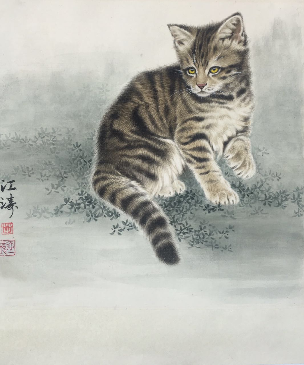 王江涛,生于1967年,中国共产党党员,幼承家学,酷爱书画,勤奋努力,数十年如一日,2013年在清华大学美术学院名家导师高级研修班学习。现为清华大学艺术研究会理事,北京典藏美术馆画家,北京重彩画会员,陕西省美术家协会会员,珍宝斋画院院长。一九九九年迎澳门回归,纪念中华人民共和国成立五十周年书画大赛 作品《神威》获二等奖;二零零三年黄河杯书画展作品《相依》获优秀奖;二零零九年纪念中华人民共和国成立六十周年陕西省中国画展作品《融雪》获三等奖;二零一三年清华大学美术学院高级研修班结业展《我的家园在哪里》获一等奖;二零一六年陕西省大秦岭画展作品《家园》入展。