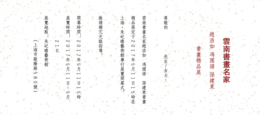 “云南书画名家赵浩如 冯国语 孙建东书画精品展”定于2017年5月11日15时在上海·朱屺瞻艺术馆(上海市虹口区欧阳路580号)
